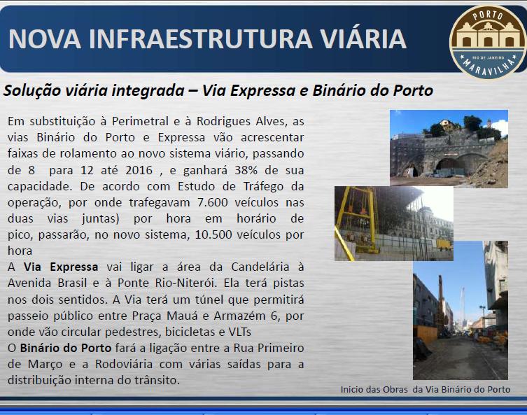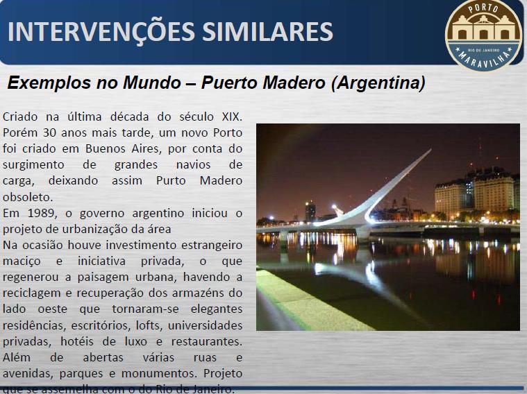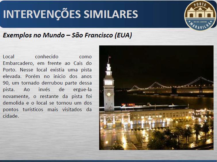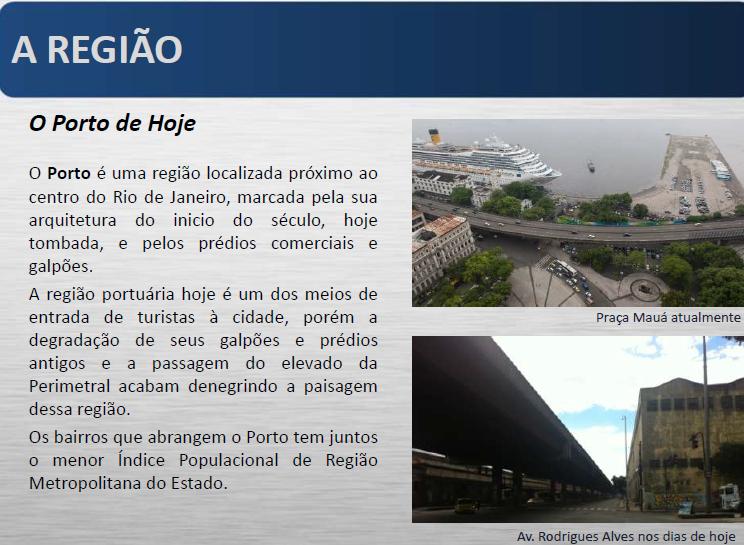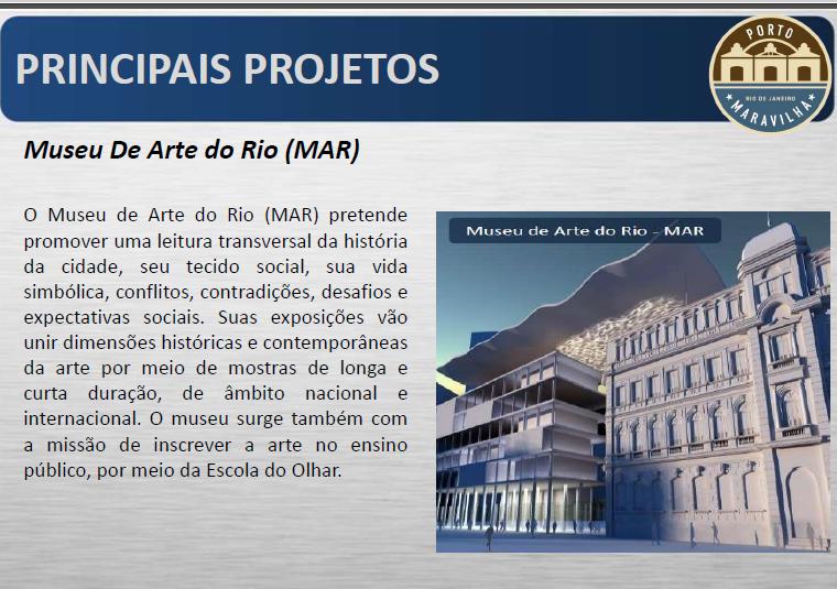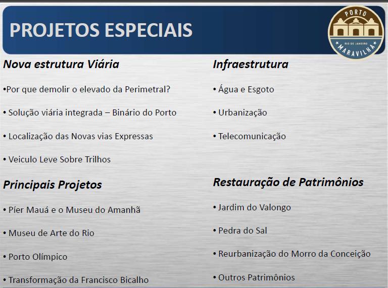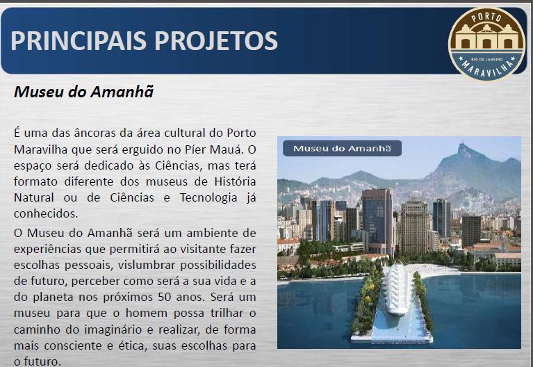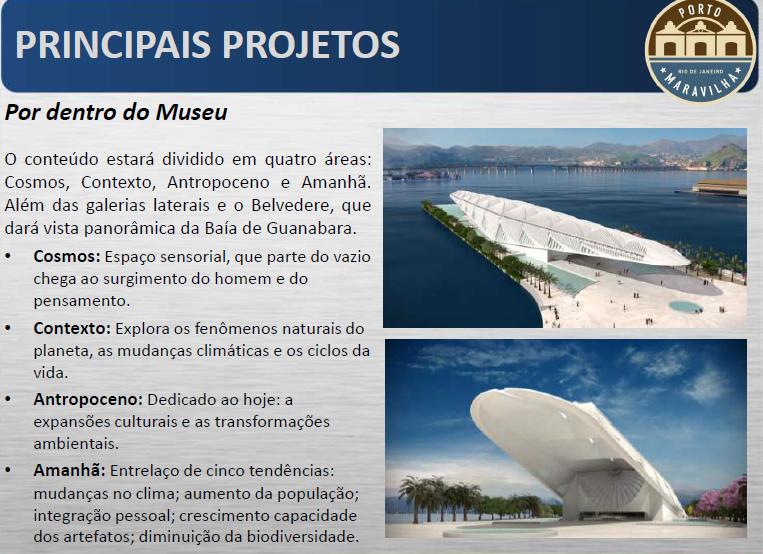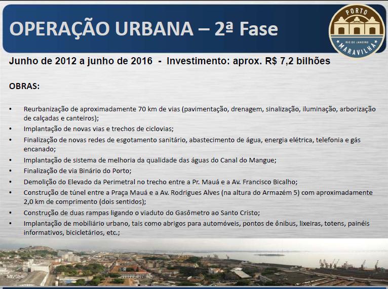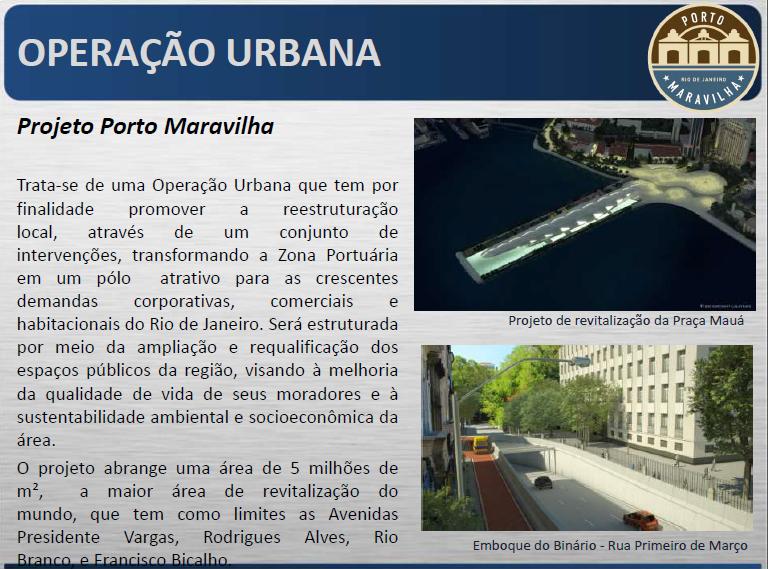 Descrição: Porto Maravilha: Trata-se de uma Operação Urbana que tem por finalidade promover a reestruturação local, através de um conjunto de intervenções, transformando a Zona Portuária